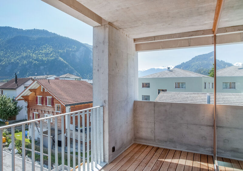 Beton ist Konzept. Als äußere Schale erlaubt er eine freie, nicht durch ein geometrisches Raster eingeschränkte Gestaltung der Fenster. Die Aussenhülle kann perforiert werden. Die Fenster werden in Größe und Position so gestaltet, dass sie den sorgfältig und individuell für jede Wohnung definierten Blick in die Landschaft harmonisch einrahmen. Die Verankerung im Ort! Dank moderner Betontechnik kann dieses äussere Schale komplett von der inneren Struktur losgelöst werden.