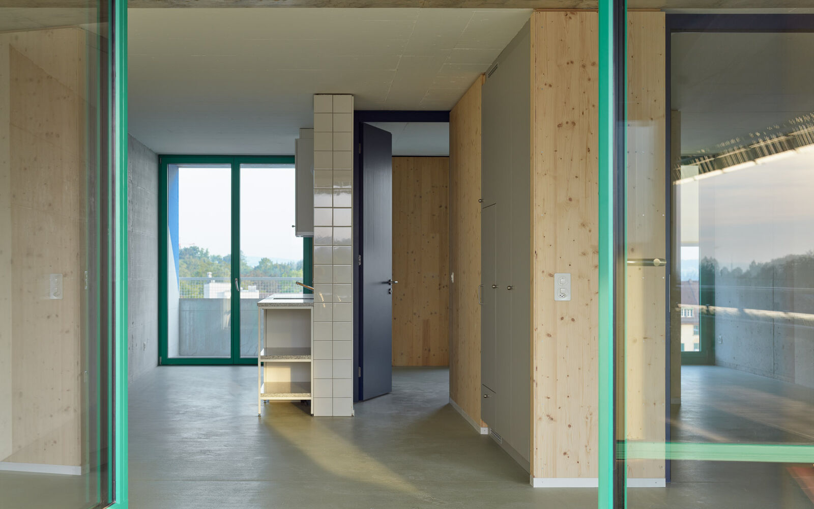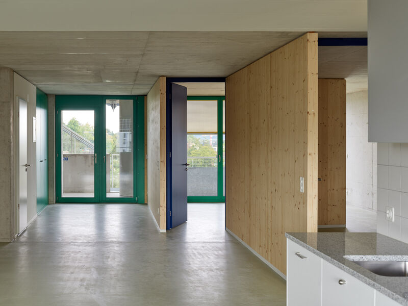 Es wird nur so viel Beton eingesetzt wie in einer Gesamtbetrachtung aus wirtschaftlicher und ökologischer Nachhaltigkeit sinnvoll und vertretbar ist. Beton kommt für Untergeschoss (reduziert durch Verzicht Einstellhalle), Betondecken (22cm bis 24cm) und Wohnungstrennwände sowie für aussenliegende Laubengänge zum Einsatz. Er wird offen gezeigt und in ein atmosphärisches Materialkonzept mit Holz, Naturstein, Terracotta und kräftigen Farbflächen eingebunden.