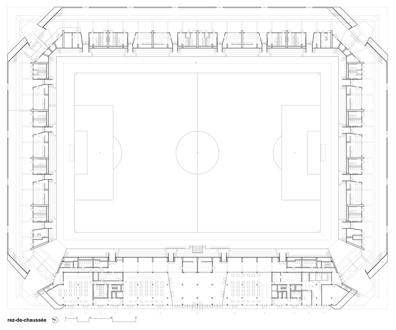 Die Eck-Öffnungen bieten Zugänge für Besucher und Anlieferungen und dienen gleichzeitig als Widerlager für die Stahlkonstruktion des Dachs. Die vier überhängenden Eckscheiben werden durch einen vorgespannten Zugring im Gleichgewicht gehalten, der im Betonquerschnitt des Tribünenlaufgangs verläuft. Der Ringschluss erfolgt in den schrägen Eckscheiben und erzeugt eine Horizontalkraft in deren vertikaler Symmetrieebene. Die Statik in den Stadionecken kommt so ohne zusätzliche Tragelemente aus.